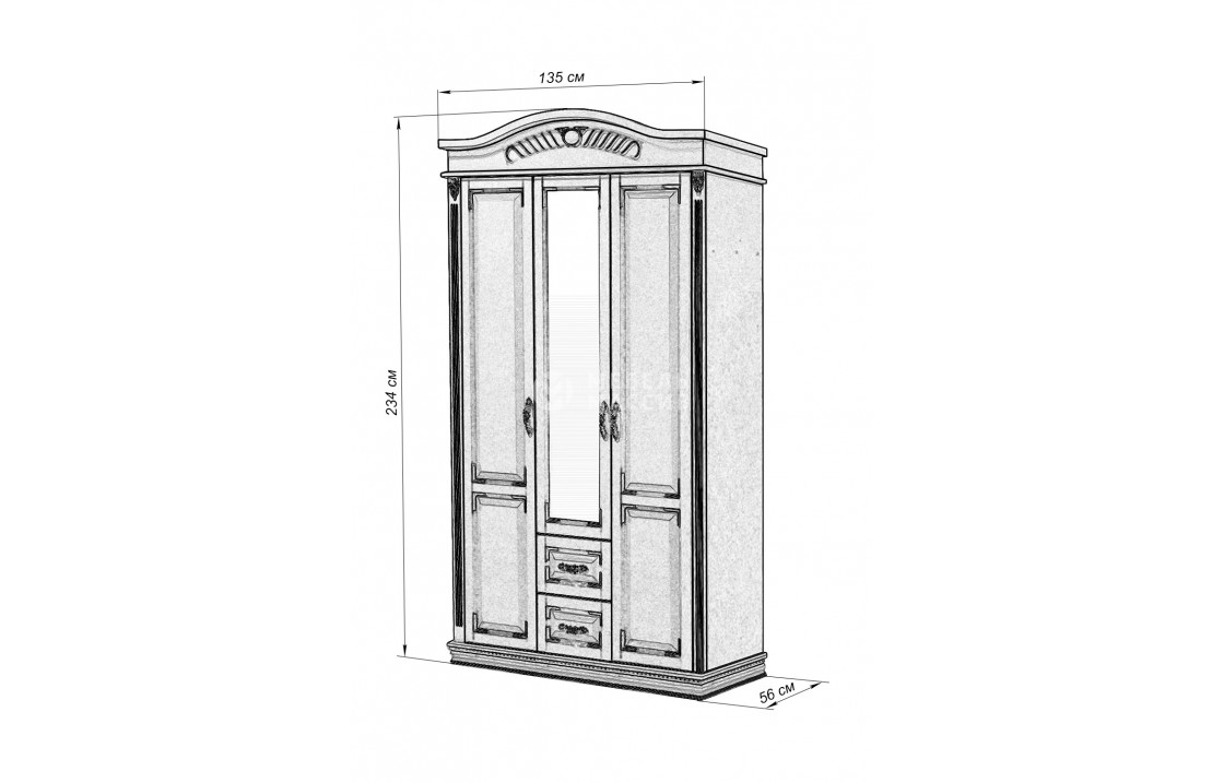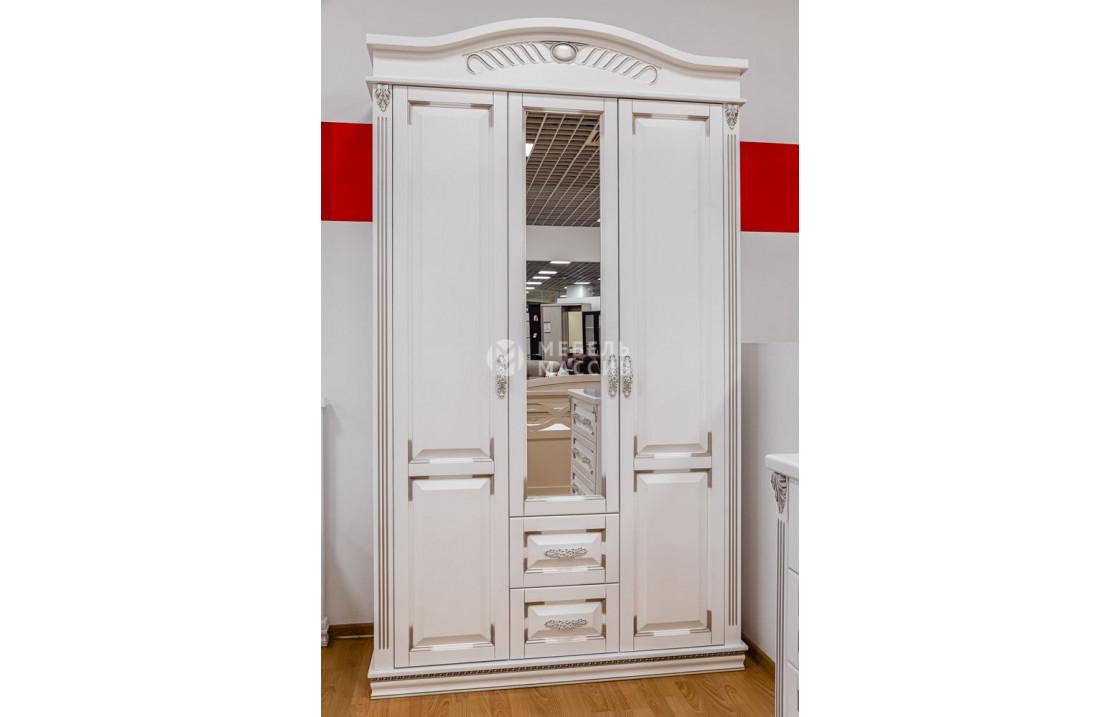 Шкаф Эйблер Люкс (белая эмаль с серебряной патиной) из натурального древесного массива имеет три основных отделения для хранения, вертикальное зеркало и пару компактных ящиков для небольших аксессуаров. отличительной чертой изделия, которое можно купить по лучшей цене в нашем интернет-магазине, является изысканный гнутый багет.| Размер | Цена | |
