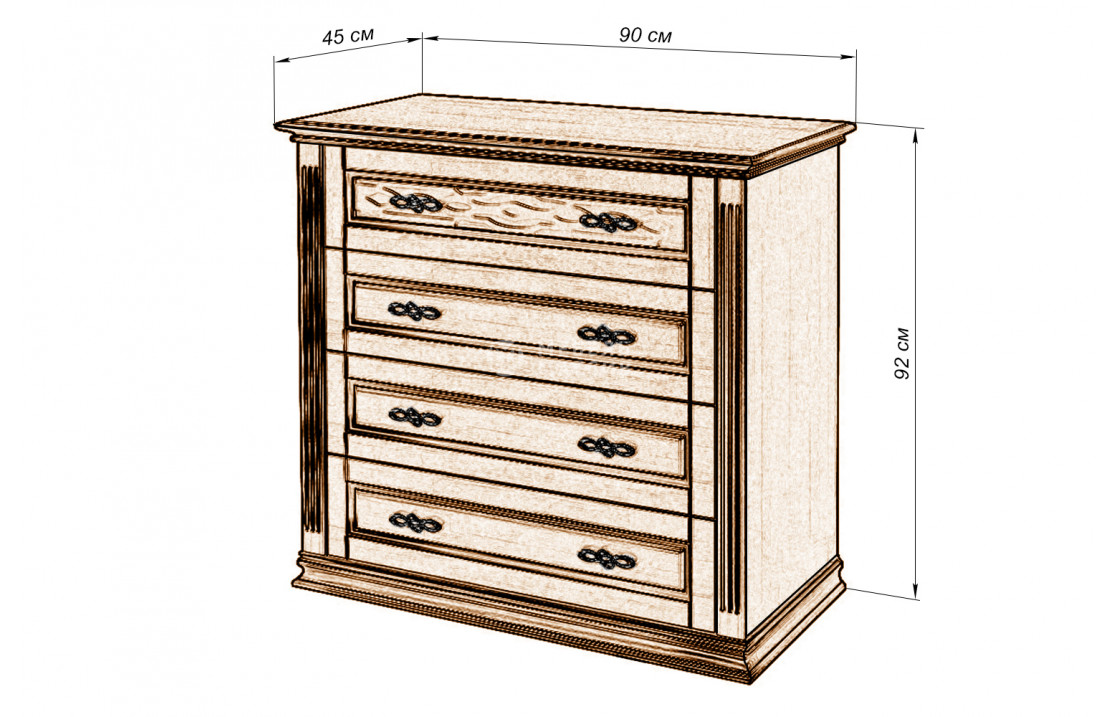 Комод Пальмира из экологически чистой натуральной древесины. модель может быть изготовлена в четырёх вариантах исполнения из древесины на выбор: сосна, берёза, бук или дуб. широкий выбор цветов позволяет органично вписаться в любой интерьер. отличается износостойкостью, надёжностью, лаконичным дизайном. купите изделие по лучшей цене с доставкой на дом в интернет-магазине «мебель массив».| Размер | Цена | |