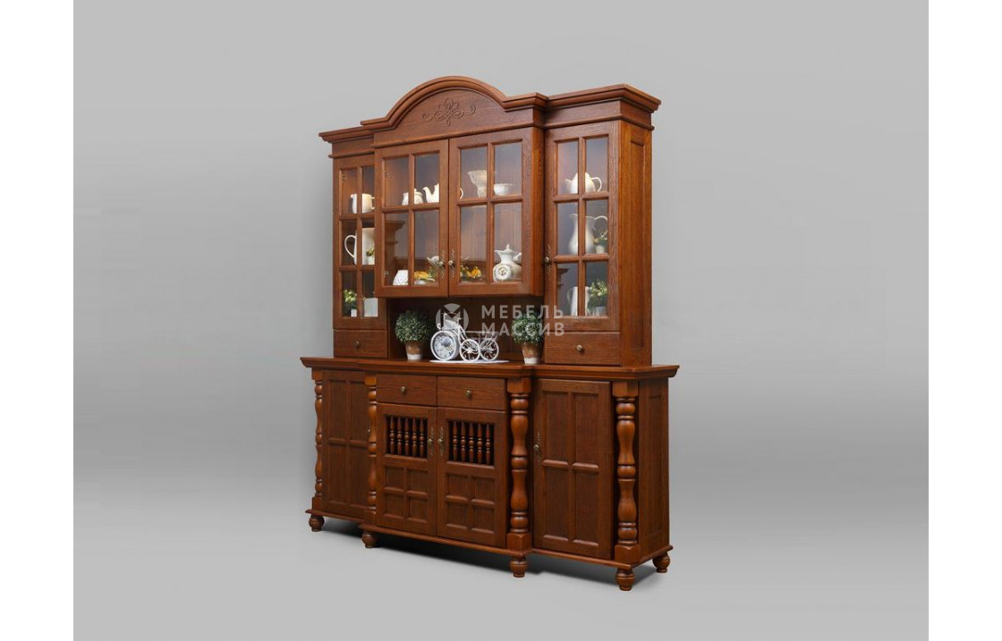 Сервант Ретро на четыре створки обязательно понравится любителям винтажной мебели. Эта модель превосходно впишется в средние или большие по площади помещения. Особенностями дизайна изделия являются резные элементы, включая боковые колонны, узоры и карниз. Функционал серванта тоже находится на высоком уровне благодаря множеству отделений и ящиков. Для изготовления модели использован массив сосны, цвет древесины и образцы ручек можно подобрать индивидуально в соответствующих разделах на странице товара. Доставка по Смоленску и Смоленской области.| Размер | Цена | |